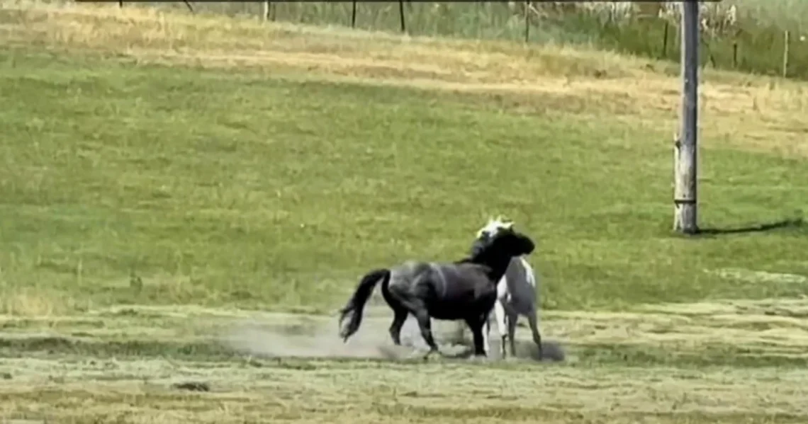Woman’s filming when black horse acts unexpectedly to older horse in herd